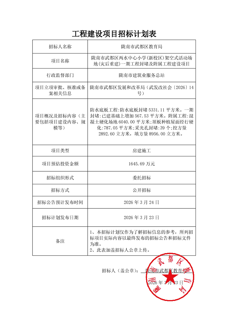 隴南市武都區(qū)兩水中心小學(xué)(新校區(qū))架空式活動(dòng)場地(災(zāi)后重建)一期工程封堵及附屬工程建設(shè)項(xiàng)目