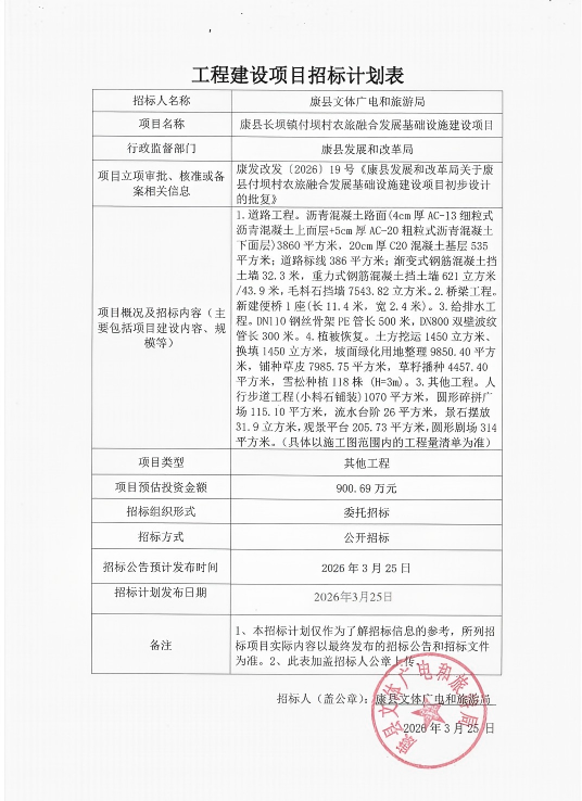 康縣長壩鎮(zhèn)付壩村農(nóng)旅融合發(fā)展基礎設施建設項目
