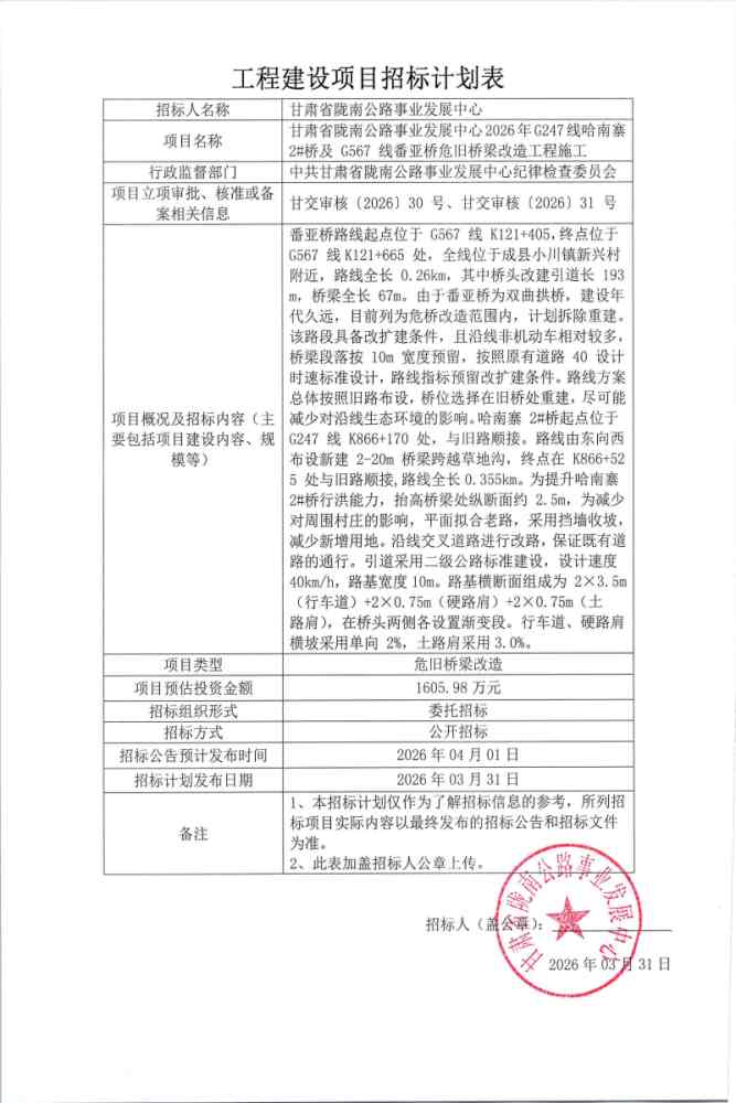 甘肅省隴南公路事業(yè)發(fā)展中心2026年G247線哈南寨2#橋及G567線番亞橋危舊橋梁改造工程施工