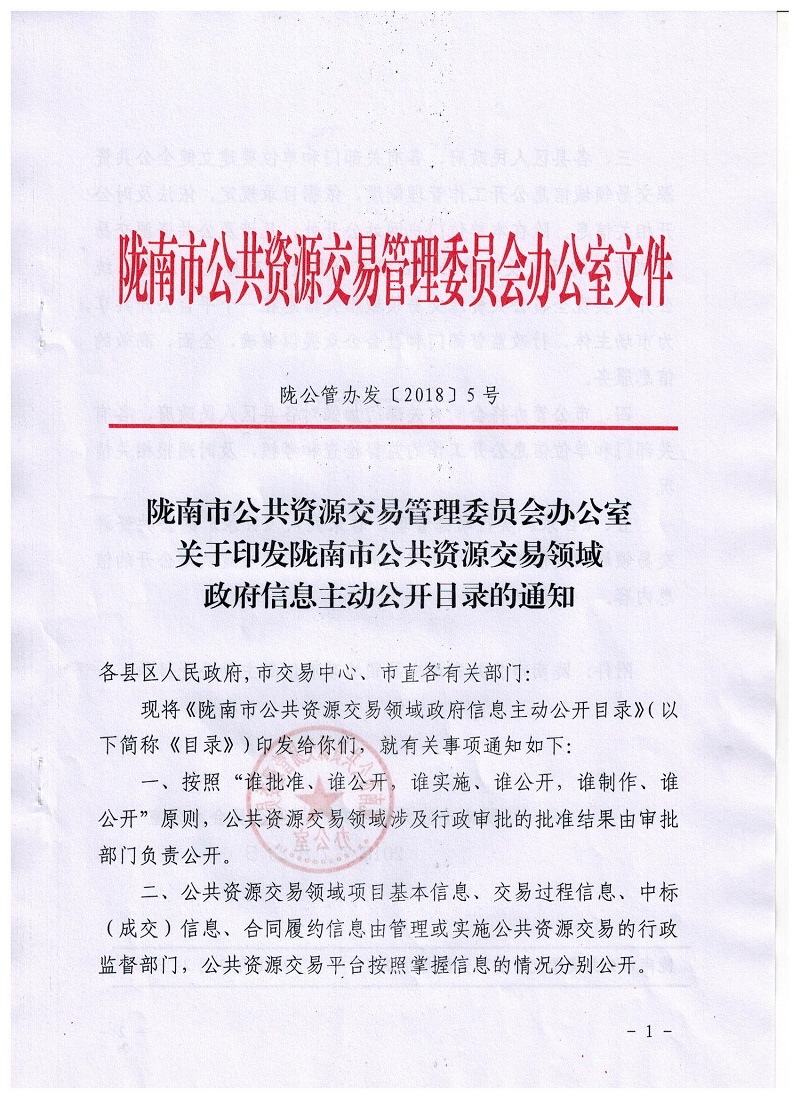 隴南市公共資源交易管理委員會(huì)辦公室關(guān)于印發(fā)隴南市公共資源交易領(lǐng)域政府信息主動(dòng)公開目錄的通知